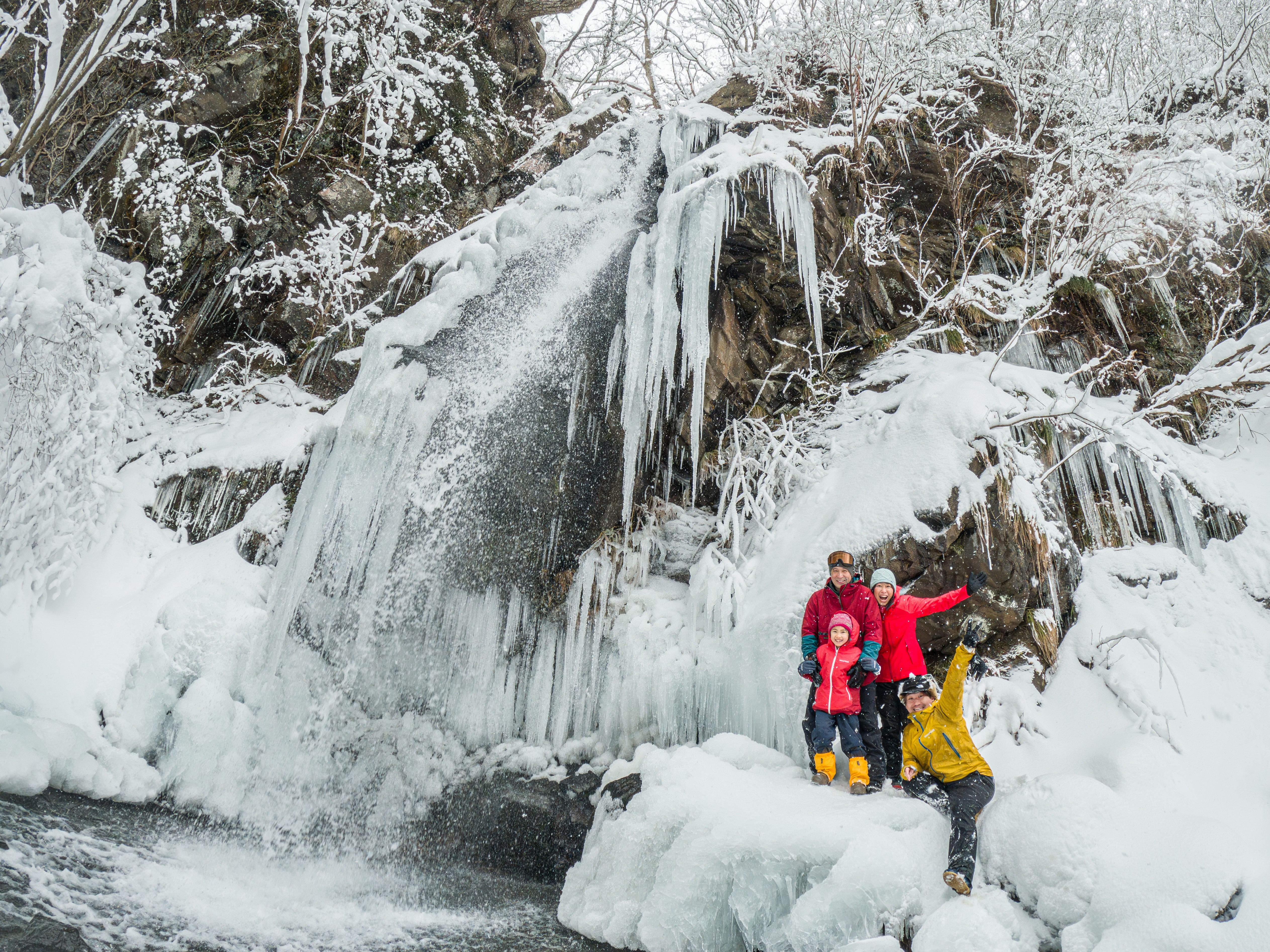 道中では雪の積もった棚田、そこから見下ろす景色は最高です!条件が良ければ、滝が凍り幻想的な景色も見れます。滝に着いたら、暖かい飲み物で雪上ティータイム!