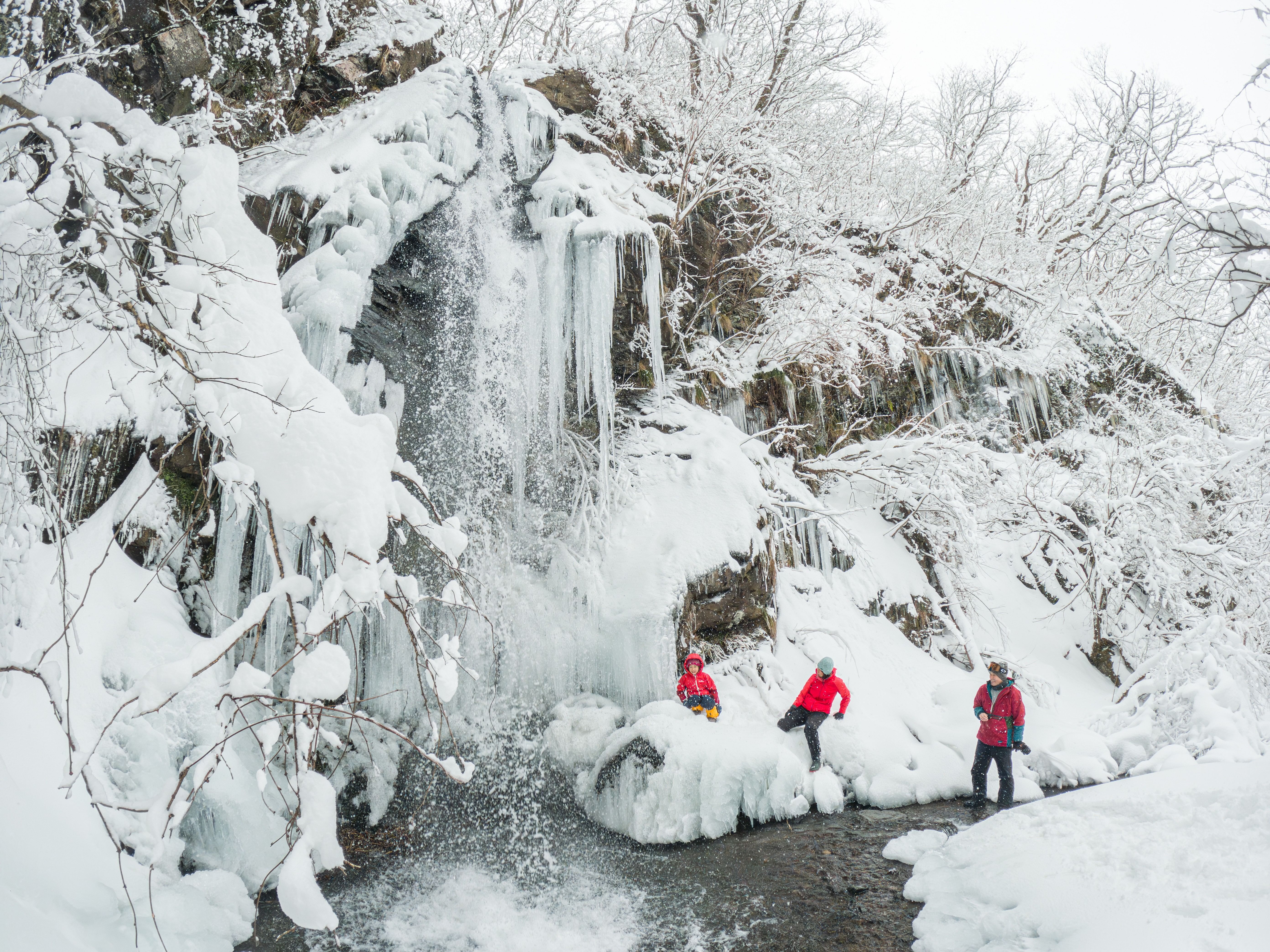 冬しか体験できない佐渡でのアドベンチャートラベル!!佐渡の自然を遊びつくしてる佐渡生れのガイド、石塚さんと一緒に佐渡の山でスノーシュー体験&冬の滝めぐり!白銀の世界をスノーシューを履いて進み、冬の滝を見に行くアウトドアツアーです。